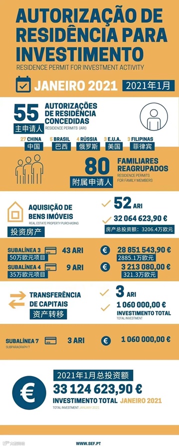 根据移民局最新数据,2021年1月共计55位主申请人和80位附属申请人获批葡萄牙黄金签证,投资额为3312.46万欧元。其中,来自中国投资者仍遥遥领先。