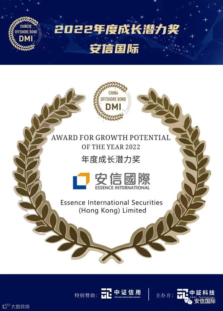 2023年2月16日,安信国际证券(香港)有限公司(“安信国际”)在中证信用科技有限公司(“DMI”) 举办的“2022中资离岸债年度机构”评选中,凭借在中资美元债承销方面的出色表现及市场认可度,在评委会的严格评选下,荣获“年度成长潜力奖”。