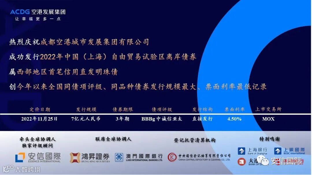 2022年11月25日,安信国际证券(香港)有限公司(证监会中央编号:AUW685)作为牵头全球协调人及独家评级顾问,助力成都空港城市发展集团有限公司(简称“公司”) 成功完成7 亿元上海自贸区离岸人民币高级无抵押债券的定价发行。本笔债券采用直接信用发行架构,发行期限为3年,票面利率4.5%,债项评级BBBg(中诚信亚太),将于澳门证券交易所上市。