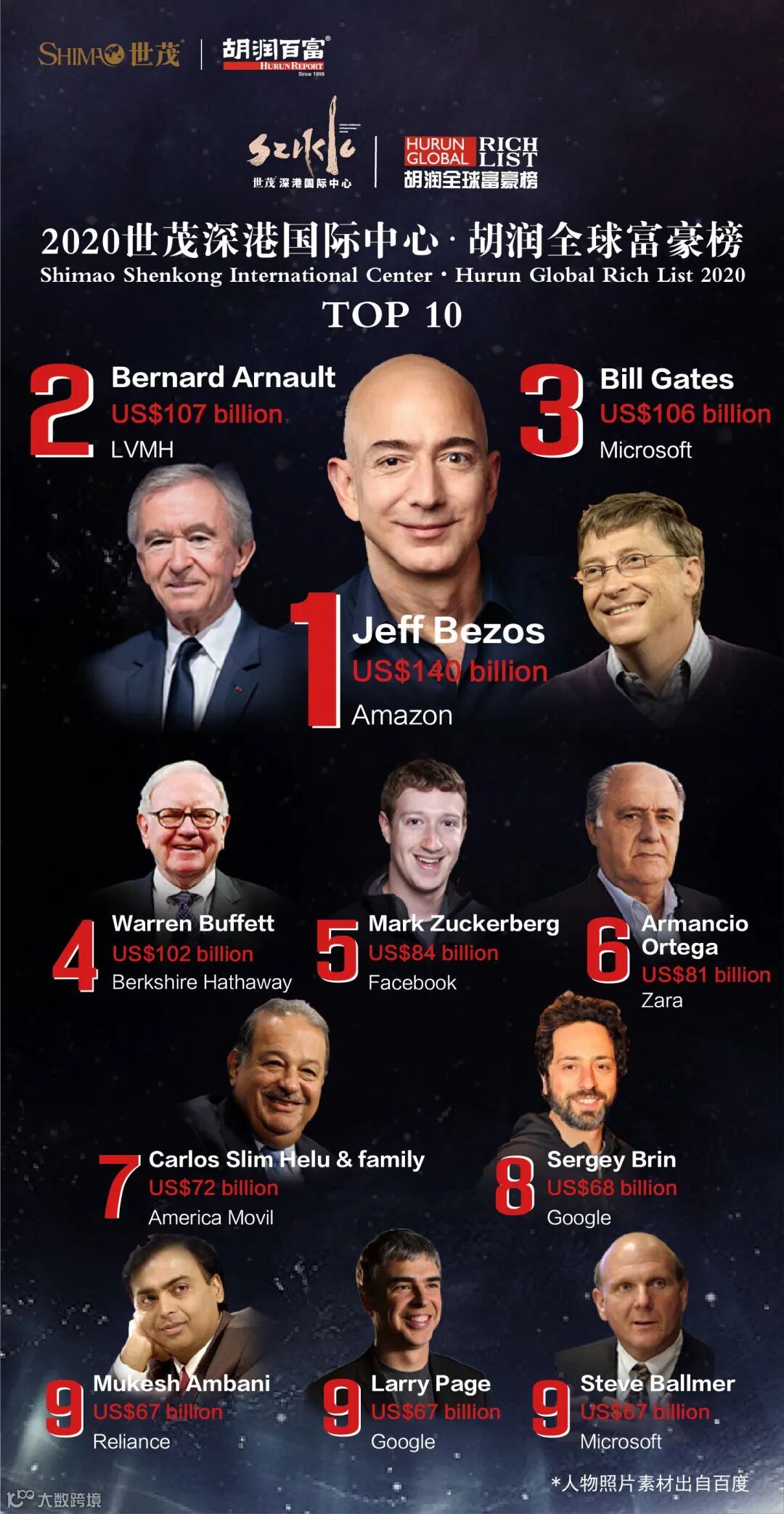 近日,胡润研究院发布了《2020胡润全球富豪榜》,全球十亿美金企业家人数增加346人,达到创纪录的2,816人。亚马逊56岁的杰夫•贝佐斯连续第三年成为全球首富。