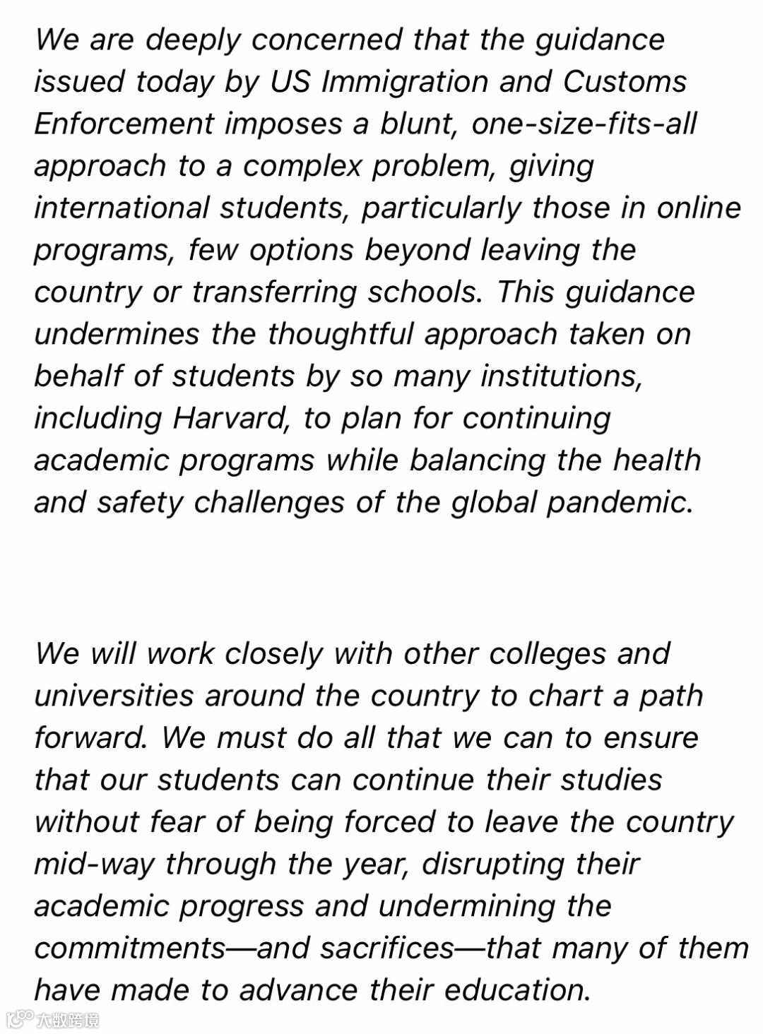 就在刚刚,哈佛大学主席(Larry Bacow)表示:他们也密切关注到这一新公布的政策,会与其他大学一起商议政策,让学生可以继续学习,不用面临中途被迫离境的恐惧。