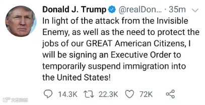 4月20日,特朗普这条推特“炸锅了”:“鉴于‘这个看不见的敌人’(指新冠病毒)的攻击,以及保护我们伟大的美国公民的工作需要,我将签署一项行政命令,暂停移民入境美国!”