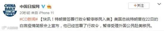 4月22日,特朗普在白宫疫情简报会上宣布,他已经签署了行政令,为期60日,且只对试图获得永久居留权的人士适用。