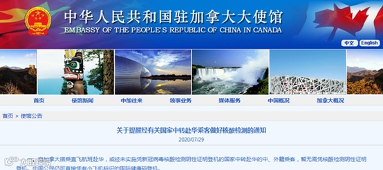 近日,中国驻加拿大大使馆发布《关于经有关国家中转赴华乘客做好核酸检测通知》,根据最新通知,自加拿大搭乘直飞航班赴华,或经未实施凭新冠病毒核酸检测阴性证明登机的国家中转赴华的中、外籍乘客,暂无需凭核酸检测阴性证明登机。但是经部分国家中转需要预先在加拿大完成核酸检测。
