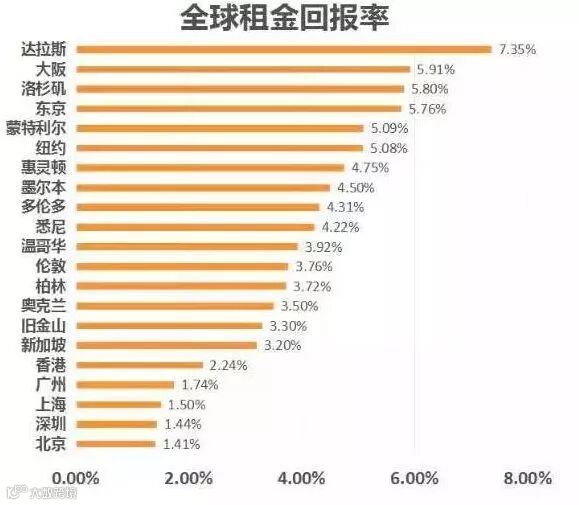 从数据来看,美国的纽约,日本的大阪、澳洲的墨尔本、悉尼都有不错的表现,租金回报率达到5%左右。