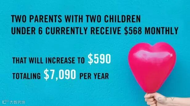 例如,一个有两个6岁以下孩子的家庭,年收入为90000元加币,现在每月可以得到568元加币,今年7月20日后,每月可增加到590元加币,一年可从6816元加币增加到7090元加币。