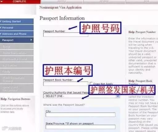 美国使馆签证处:当您在网上填写申请表(DS-160)时,将鼠标放在问题上,您会看到中文翻译,但请注意,您必须用英文回答问题。