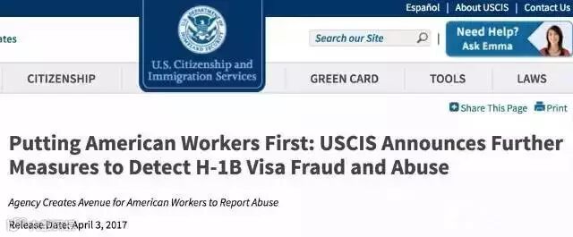 USCIS(移民局)官网同时发布了一则重要通知:《以美国员工优先:USCIS宣布将进一步严厉打击H1B签证欺诈及滥用》