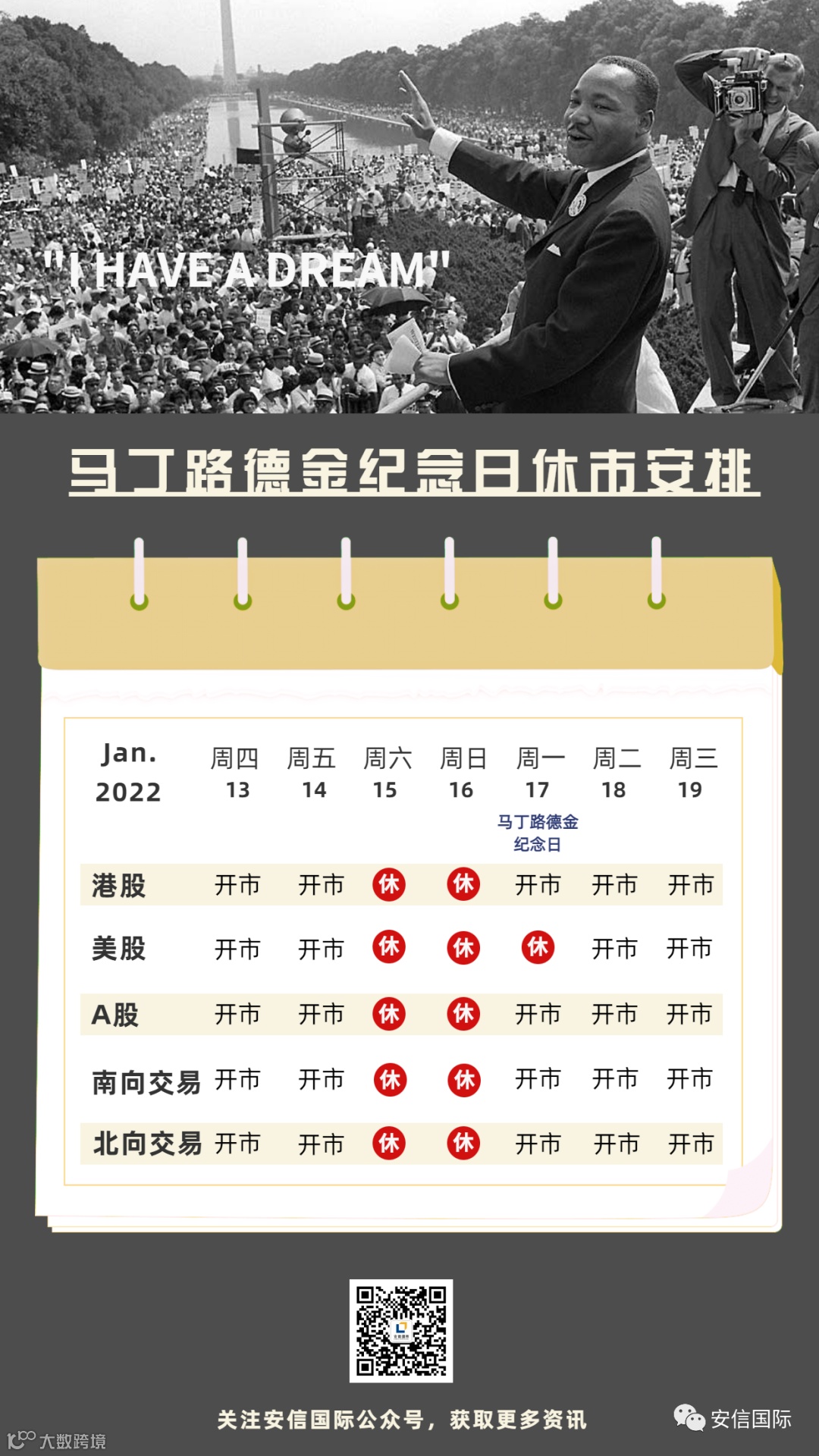 安信国际 | 马丁路德金纪念日休市安排(今日美股休市)