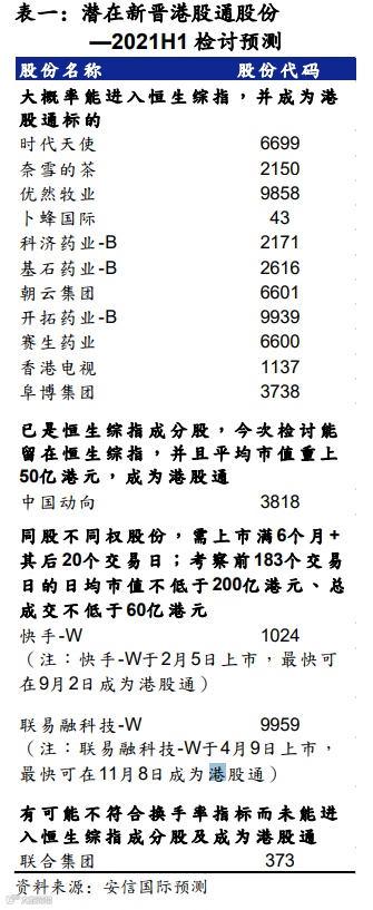 筛选结果:14只潜在新晋港股通标的(包括同股不同权的:1.快手-W1024.HK,已经是恒生综指成分股,最快9月2日能成为港股通;2.联易融科技-W9959.HK,将进入恒生综指,最快于11月8日成为港股通),9只现有港股通被剔除:根据万得及彭博的股份交易数据,我们筛选出14只大概率成为新晋港股通标的股份3,详见表一。另外,有1只联合集团373.HK,其股份市值足够大,但“换手率指标”处于门槛边缘位置,未必能进入恒生综指。我们也注意到,百融云-W6608.HK也能进入恒生综指,但由于市值低于200亿港元,未能成为港股通。