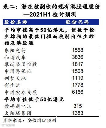 我们预测9只港股通股份将被剔除,因预期这些股份会被剔出恒生综指之外,详见表二。