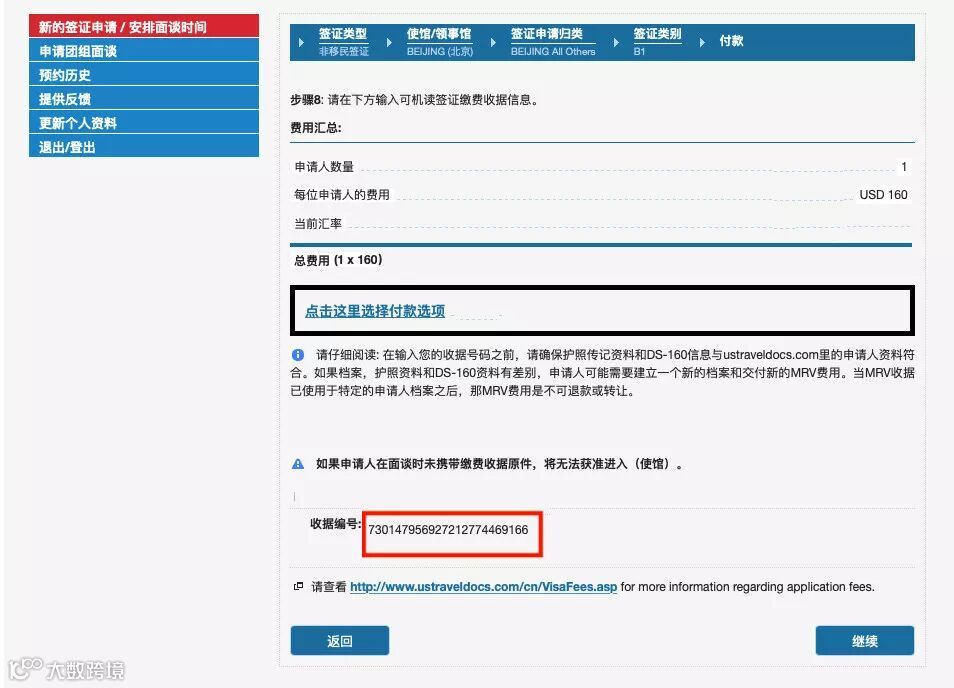 页面稍后跳转回到ustraveldocs.com网站。在您点击“继续之前,请确保您截屏这一页面或者写下或者复制粘贴您的收据号码;
