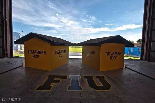 早在2012年8月24日,FIU国际飓风研究中心就进行了第一次飓风模拟测试。当时,为了展示这部“风墙”模拟装置的威力,FIU国际飓风研究中心还专门建造了2个花园凉棚一般大的屋顶模型结构,并涂上了FIU的标志性颜色——蓝色和金色。