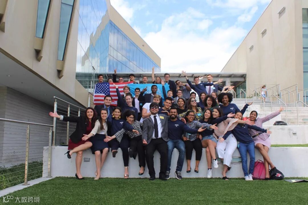 MAGA学院大门外合影,背景为FIU最高的地标性建筑Green Library