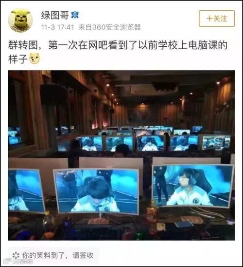 在网吧里,电脑屏幕整齐划一,跟上电脑课一样