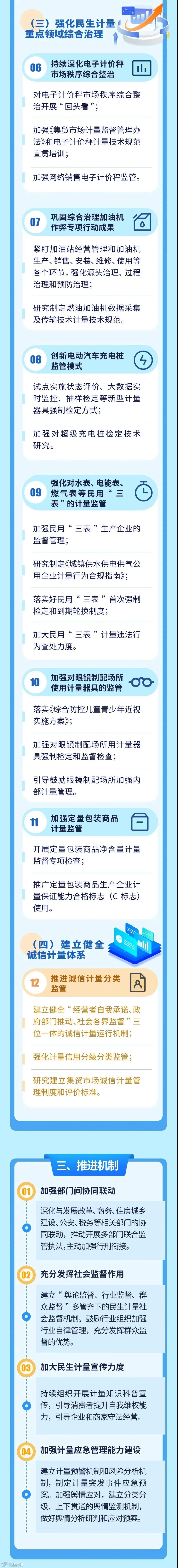 《方案》明确了到 2030 年的总体目标:计量法完成全面修订,配套法规规章同步完善。计量器具强制检定项目省级及以下建立社会公用计量标准覆盖率在现有 90% 的基础上进一步提升。全国民生计量智慧监管平台建成并投入使用,培育 30 万家诚信计量单位,打造一批有影响力的诚信计量品牌。通过一系列举措,使计量安全风险防范更科学,企业计量行为更规范,计量作弊等违法行为显著减少,充分发挥民生计量维护群众权益的作用。