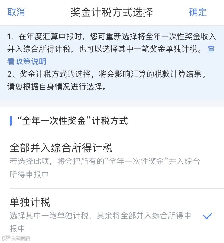 提醒:由于每个人的收入情况不同,适用哪种计税方式更优需要具体计算分析,建议纳税人可以登录个人所得税手机APP,点击“奖金计税方式选择”,查看不同计税方式下的应纳税额。