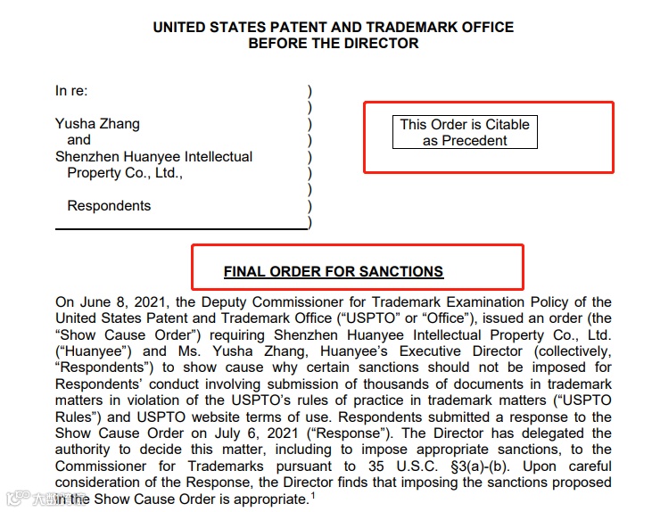 近日,美国专利商标局在USPTO官网正式发布了对深圳某公司实施了包括非法代理、代签申请、提供虚假地址、共享申请账户等多项触犯USPTO底线的行为的裁决。