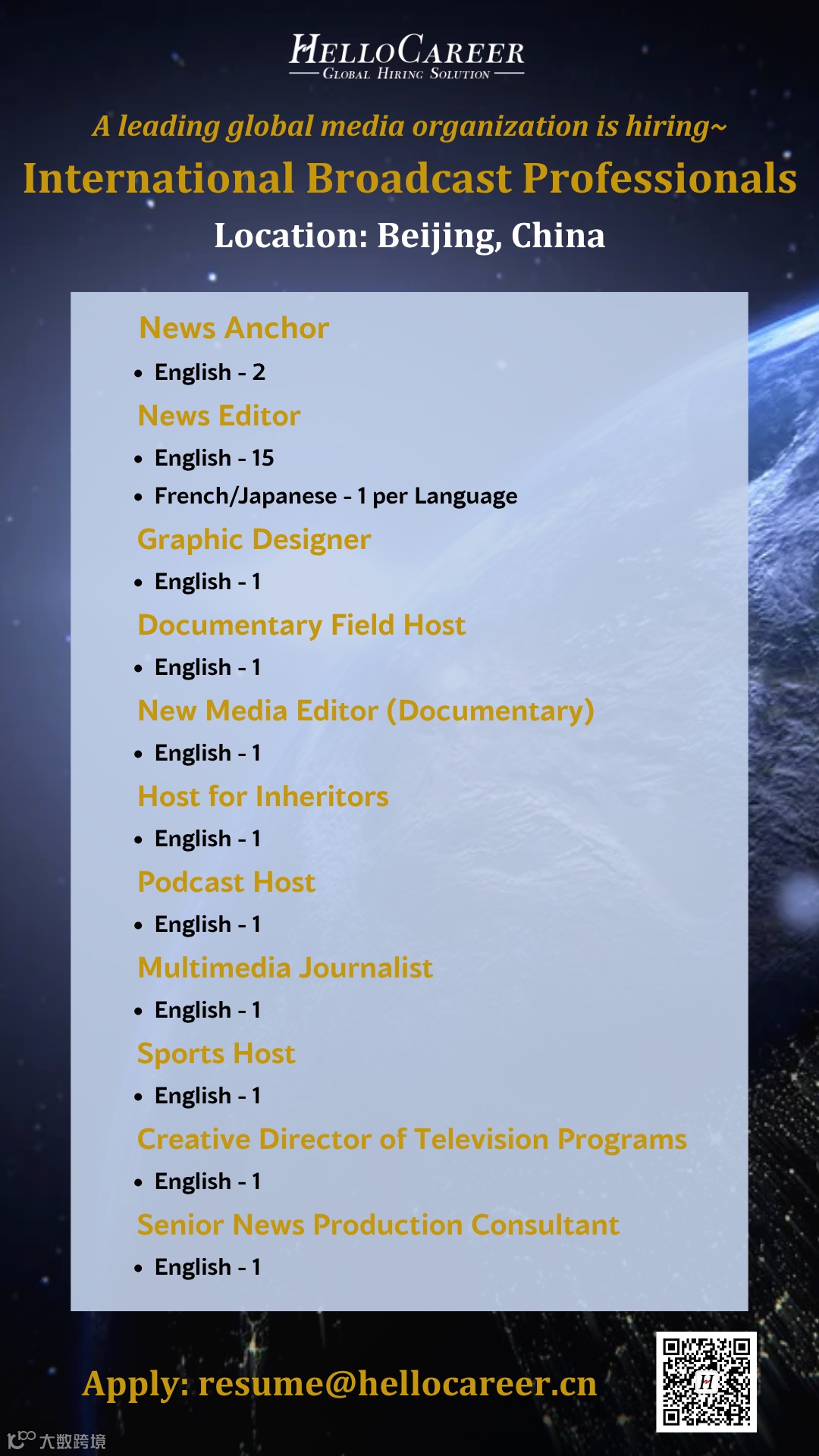 We are now seeking an Anchor, General News, to join the news presenting team at our global headquarters in Beijing, China.