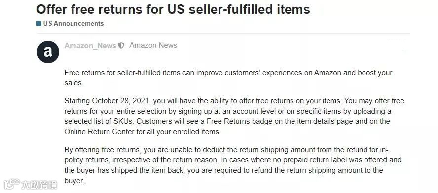 亚马逊美国站发布公告:要求自配送卖家自10月28日起,为所有自配送订单提供免费退货服务。
