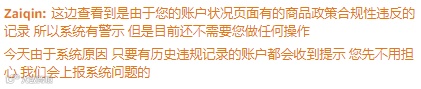 有卖家就此问题咨询了亚马逊客服,得到的回复是:“今天由于系统原因,只要有历史违规记录的账户都会收到提示,您先不用担心,我们会上报系统问题的”。