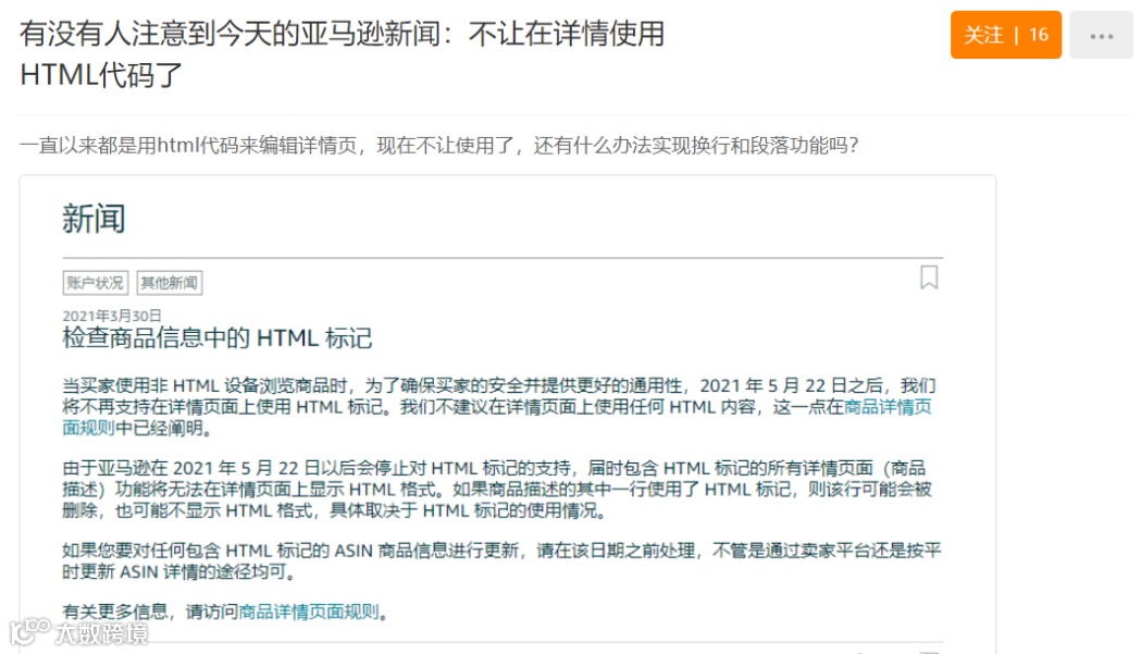 据亚马逊方表示,为了确保买家的安全,并提高在非HTML设备上显示商品的通用性,2021年6月27日之后,亚马逊将不再支持在商品详情页面的商品描述中使用HTML标记,并将停止显示其HTML格式。