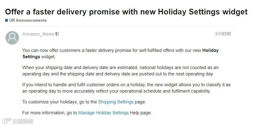 针对自配送卖家,亚马逊英国站近期也发布了新公告:宣布上线新功能“假期设置”。公告表示,法定假期不算在工作日当中,不计在发货和交货时间之内,以下是公告原文: