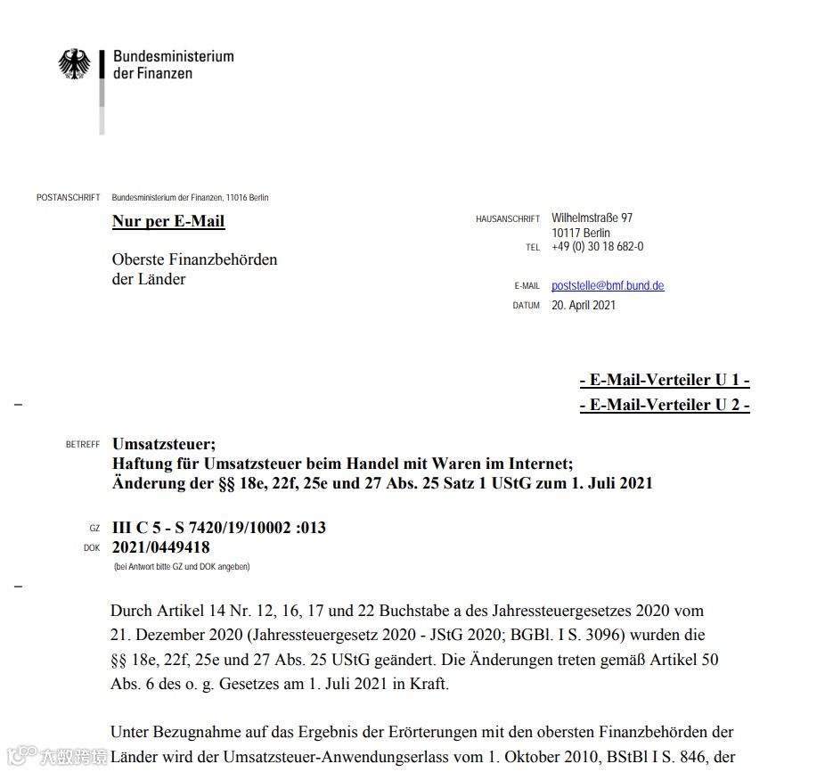 日前,德国联邦税务局就税务证书方面发布了新政策:从2021年7月1日起,平台不再需要税务证书,只需要德国本地税号和VAT号码即可。