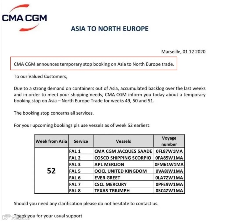 最新消息称,近日,达飞发布一则通知,由于亚洲地区的集装箱需求紧缺,在过去几周有大量订单积压严重,为满足运输需求,暂时停止接受第49周,50周,51周的亚洲到北欧的新订舱需求,有新的订舱需求的客户,最早要从第52周起开始。