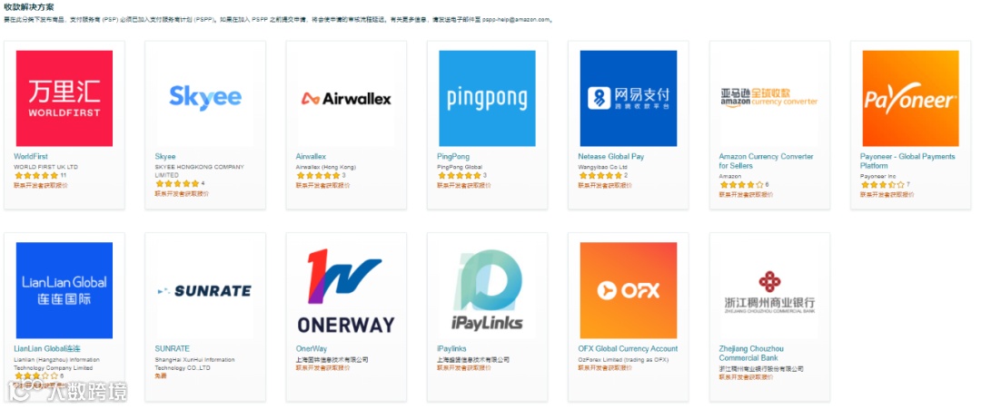 同时,亚马逊还表示正在努力争取让更多合格的支付服务商加入该计划,每周都会更新PSP名单。卖家们需选择以下支付服务商才算合规。