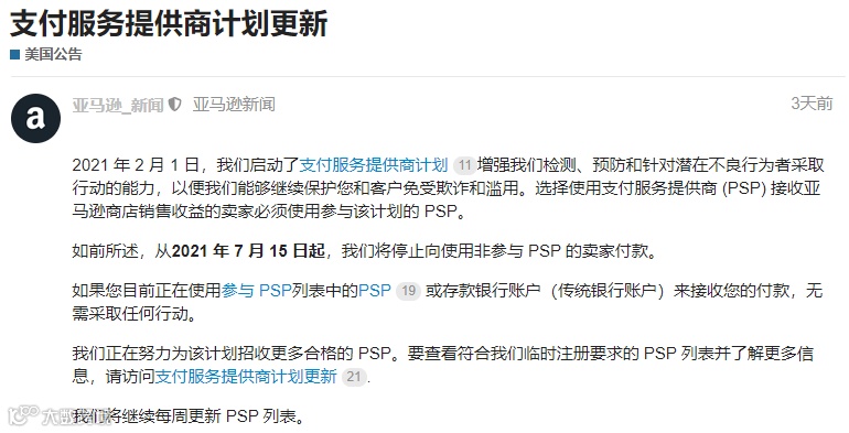 *自2021年7月15日起,亚马逊将完全叫停使用不参加计划PSP的卖家付款。