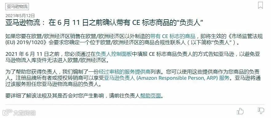 根据上述相应平台出台的政策,可见欧盟负责人的重要性。所以,为了避免亚马逊物流入库货件无法进入欧盟/欧洲经济区,建议卖家朋友还是尽快注册欧代,并在负责人控制面板中填报 CE 标志商品的欧盟负责人信息。