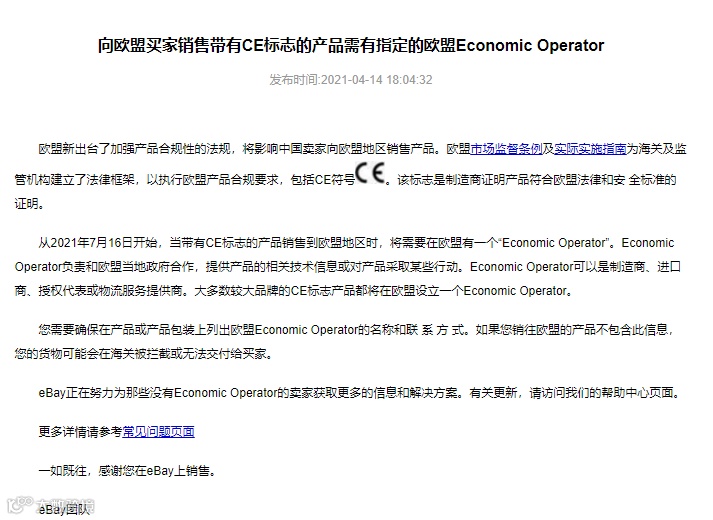 从2021年7月16日开始,当带有CE标志的产品销售到欧盟地区时,需要在欧盟有一个“Economic Operator (欧盟负责人) ”, 您需要确保在产品或产品包装上列出欧盟Economic Operator的名称和联系方 式。如果您销往欧盟的产品不包含此信息,您的货物可能会在海关被拦截或无法交付给买家。