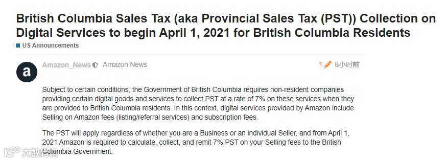 亚马逊最新公告称:不列颠哥伦比亚省政府要求非本地公司向居民提供某些数字商品和服务时,一定条件下将以7%的价格收取PST(省销售税)。