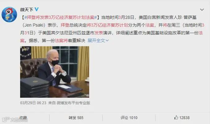 据相关新闻报道,拜登在其就任以来的首个新闻发布会上表示,继1.9万亿纾困法案后,美国政府又将推出3万亿美元的经济复苏提案,以借此改善美国的基础设施建设、应对气候变化,振兴美国经济。
