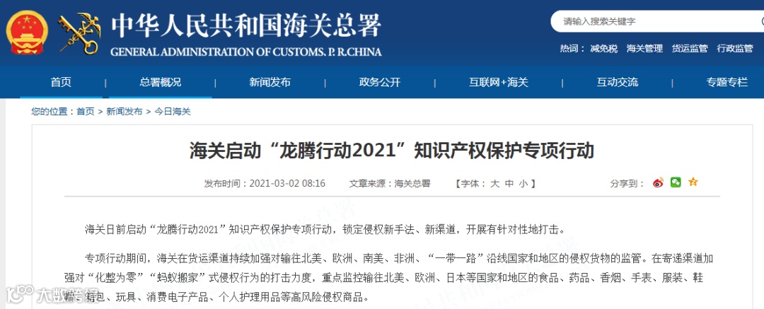 据海关总署官网3月2日消息,海关日前启动“龙腾行动2021”知识产权保护专项行动,锁定侵权新手法、新渠道,开展有针对性地打击。