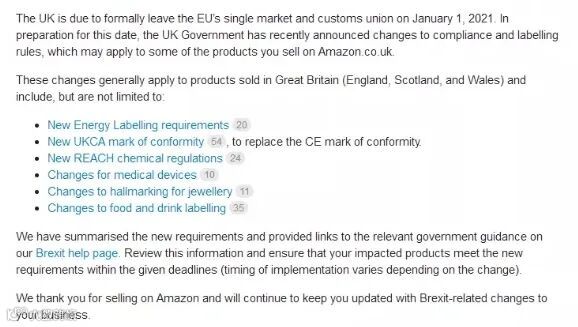众所周知,英国将于明年1月1日正式“脱欧”,意味着英国正式退出欧盟单一市场和海关联盟。随着脱欧日期的临近,亚马逊平台的政策也将随之更新。除了税费改动,近期亚马逊还发布了“商品合规性和贴标要求变更” 的通知。