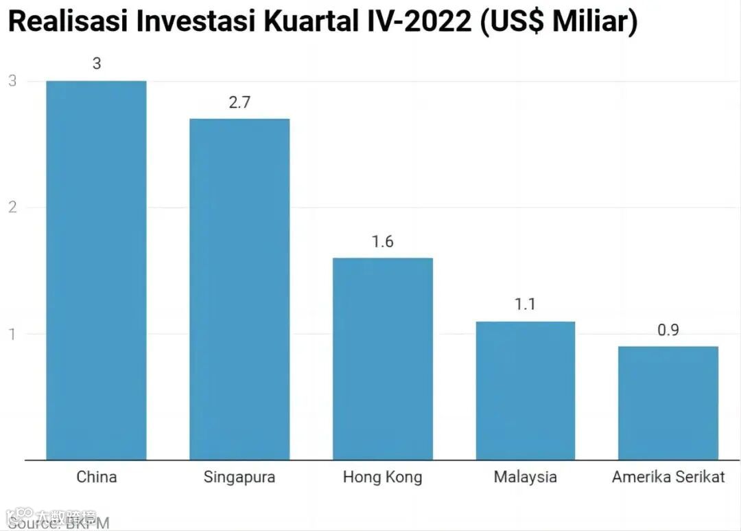 因此,随着经济的加速增长,投资印尼肯定会更加有利可图。根据投资部/投资协调委员会(BKPM)的数据,2022年第四季度中国对印尼的投资为30亿美元(约合45万亿印尼盾),这一价值高于新加坡投资的27亿美元。与2021年第四季度同期仅为9亿美元相比,中国的投资额剧增了约230%!