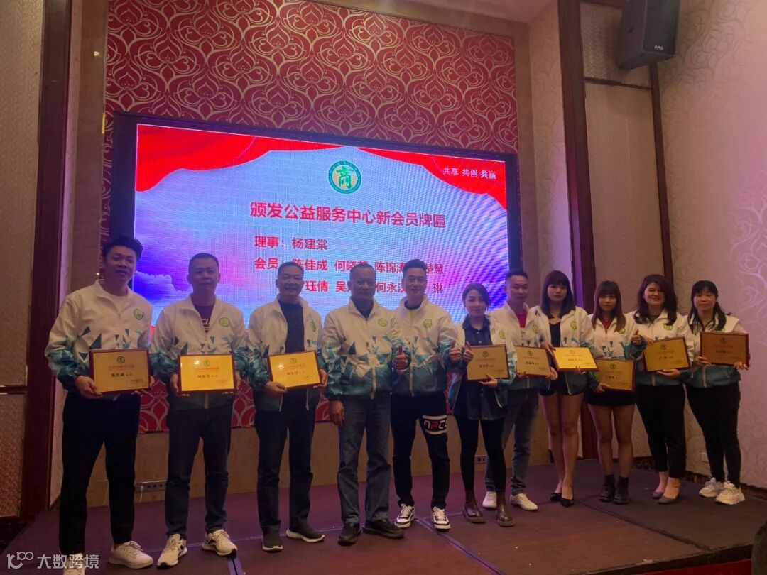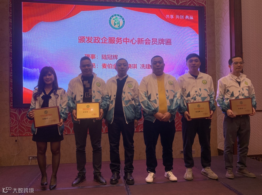 ▲常务副会长/副理事长吴日雄、副会长/政企服务中心组长黄少挺为新理事陆冠辉,新会员麦伯金、冯晓琪、冼建成颁发牌匾
