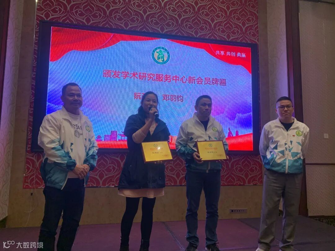 ▲常务副会长徐仁良、学术服务中心组长/理事李学伟为新会员阮政霖、邓羽钧颁发牌匾