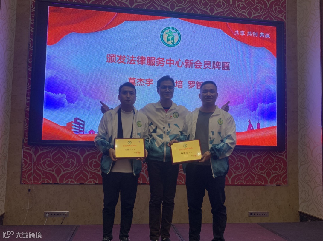 ▲党支部书记/副会长/法律服务中心组长黄创成为新会员莫杰宇、林添培颁发牌匾