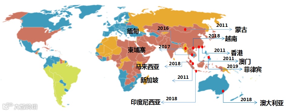 截止到目前为止,蒙牛产品已经出口到香港,澳门,蒙古,新加坡,缅甸,柬埔寨,印度尼西亚, 菲律宾,越南和澳大利亚。