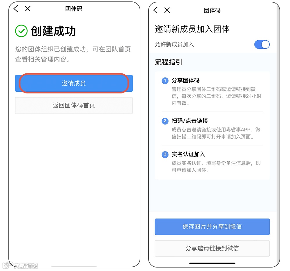创建人成功创建团体后点击“邀请成员”,可将邀请链接或图片二维码发送给成员扫码加入。邀请链接有效期为24小时,失效后,可联系管理员分享新的邀请链接。