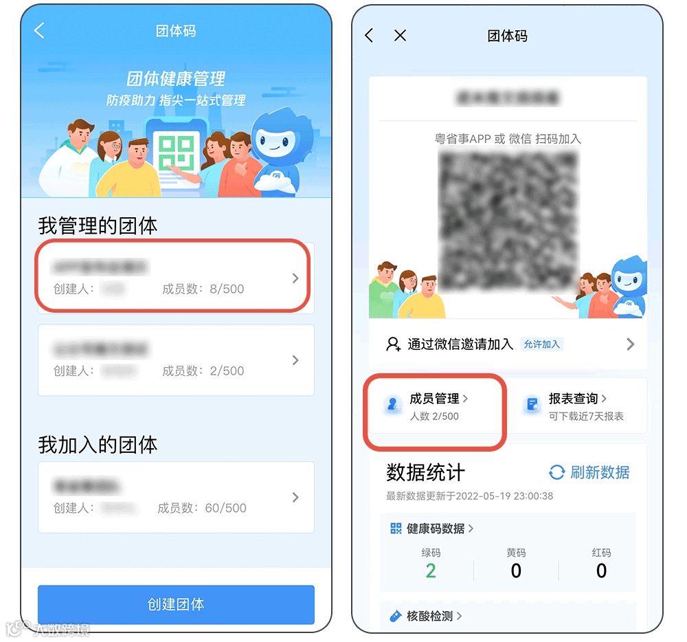 “团体码”支持用户创建、管理团体码和查看已加入的团体信息,以管理团体为例:用户完成创建后,可在首页“成员管理”处实时查看成员健康信息,并通过“报表查询”下载7天内健康报表;“团体应用”处可自定义“省内行程”等健康应用,实现团体防疫“指尖管”服务更易用、更便捷。