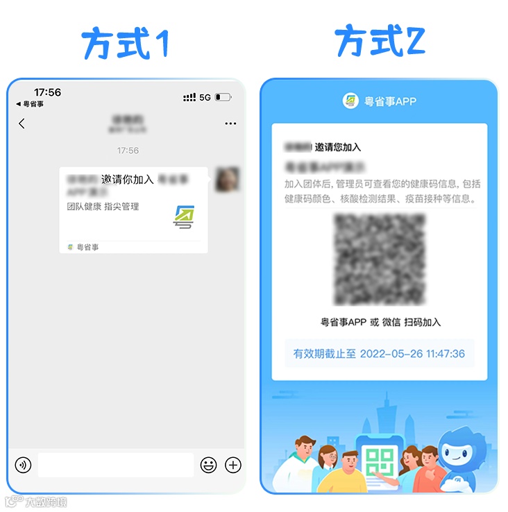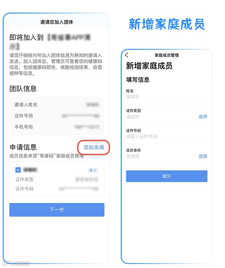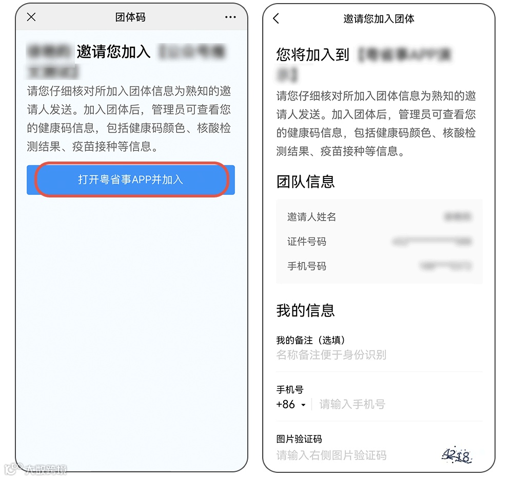成员通过点击邀请链接或扫描图片二维码的方式进入加入团体页面,点击“打开粤省事APP并加入”。进入授权页面后填写个人信息及验证码,勾选同意健康声明,点击“授权并加入团体”,完成加入团体。