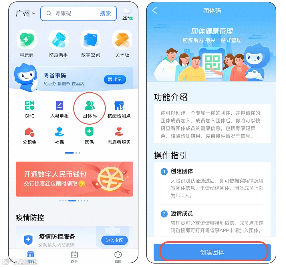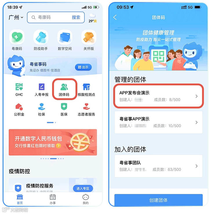 在粤省事APP首页点击“团体码”,进入创建团体页面,填写团体名称、团体类型、团体地址、手机号、验证码等信息后点击“创建团体”。
