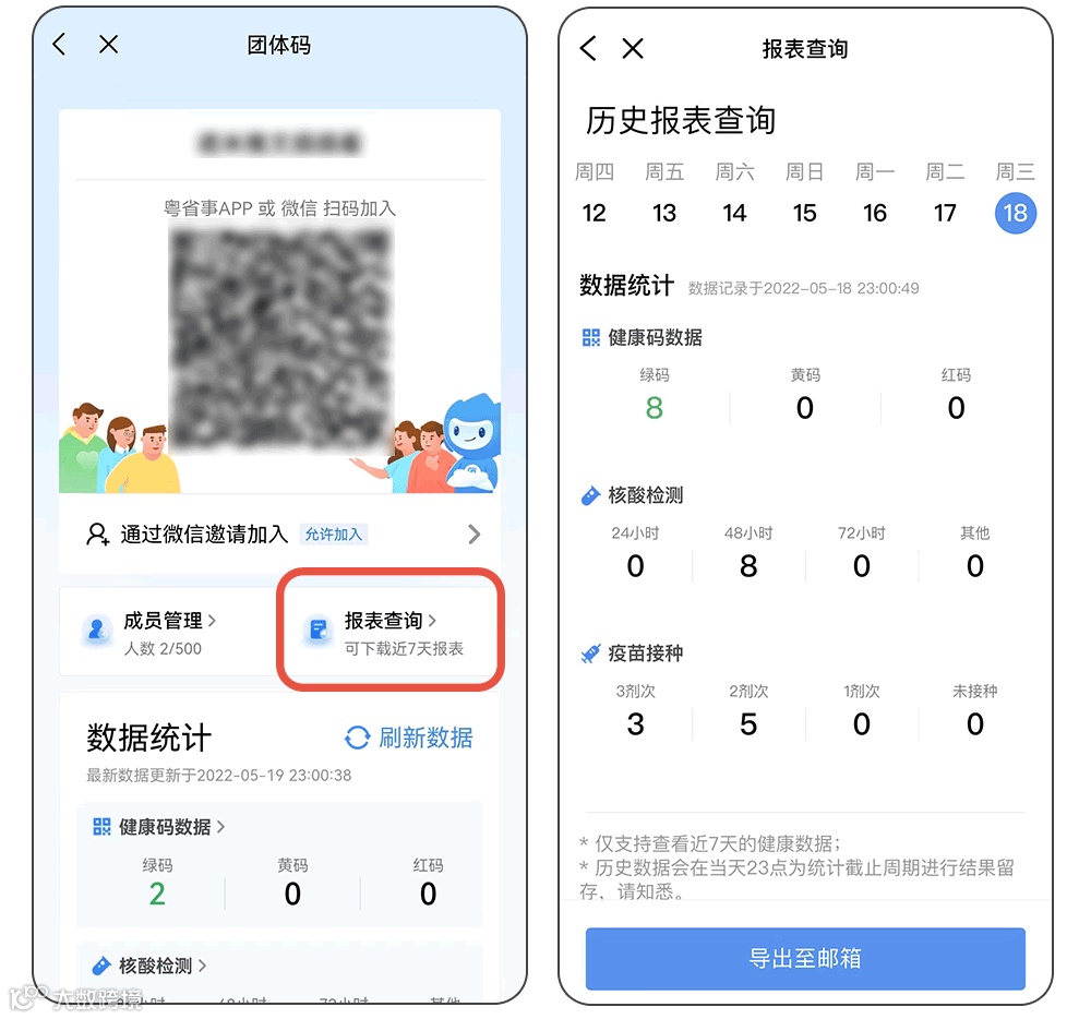 团体创建人、管理员进入团体详情页后,点击“报表查询”,可查看近7日的团体健康数据。点击“导出至邮箱”,选择对应的日期并填写邮箱地址,可将团体健康数据发送至对应邮箱。基于报表中的数据,各单位机构可以依据需要进行汇总排查。