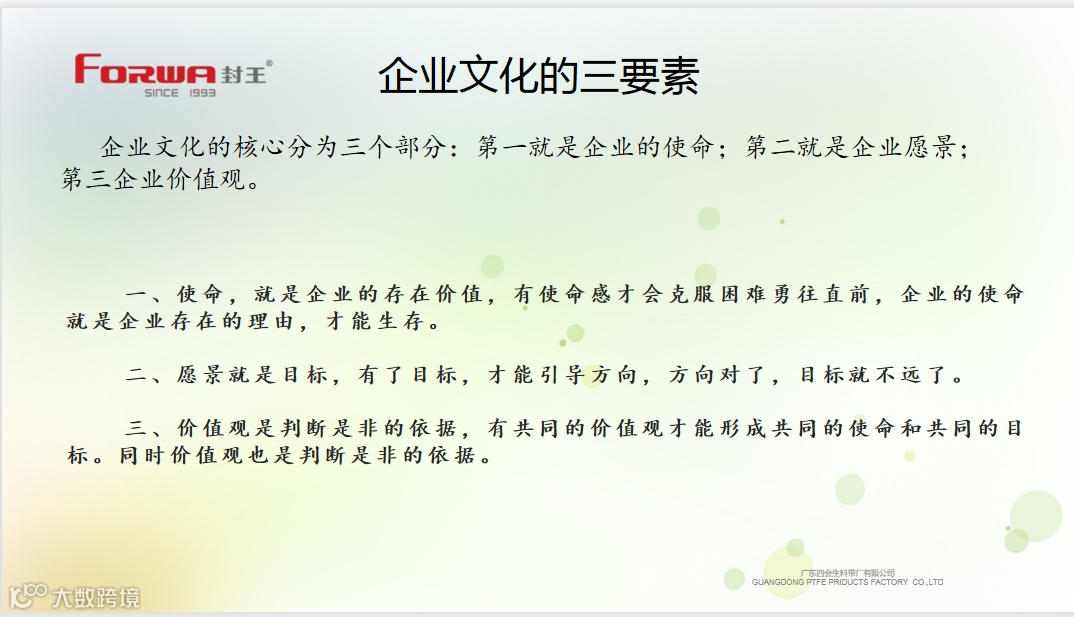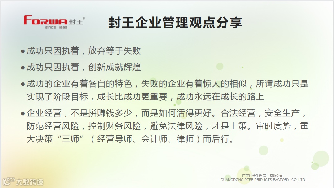 分享会中,曾总为我们在座的会员企业家分享封王企业文化、封王发展历程,特别提到,企业文化最重要的是创建别人不容易或者不能复制的优势,才是企业特色,包括核心技术,人才团队、规模、先进的发展理念等等。特色才是文化。