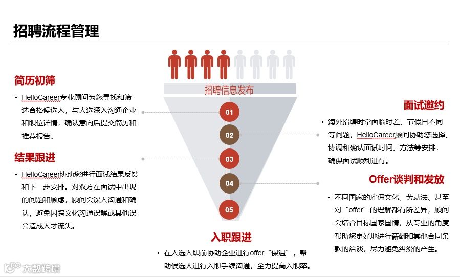 基于企业的行业领域、业务规模、发展现状和海外发展计划,我们可以协助您分析招聘需求,制定更有针对性和可操作性的海外招聘策略。