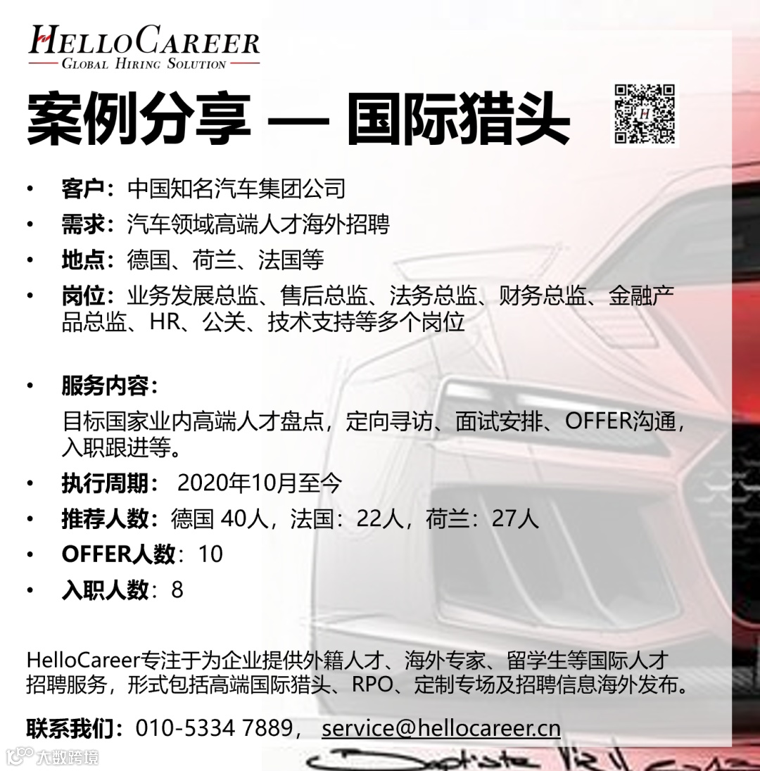 HelloCareer致力于成为中国企业和机构吸引海外优质人才的一站式专业平台,通过不断丰富公司自有资源,同时整合不同国家和地区的外部资源,我们已经成功为TMT、汽车与零部件、科技制造、金融投资、生物医药等不同行业的近百家公司和机构提供了定制化的国际人才招聘服务,帮助若干出海中资企业梳理海外招聘需求、组建海外团队或招募海外专业人才。